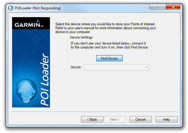 Following the program installation, a wizard will guide you through the process of adding POI locations onto your GPS Device. When you reach the screen below, please insure your GPS device is connected to your computer before proceeding.